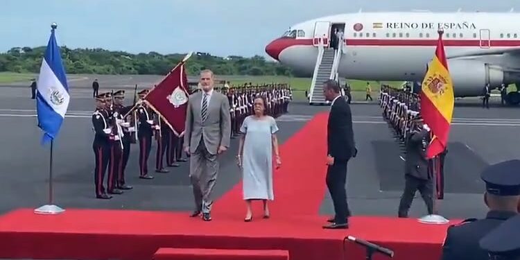 Don Felipe fue recibido al pie del avión por la ministra de Relaciones Exteriores, Alexandra Hill Tinoco, junto a una comitiva de representantes del Gobierno salvadoreño.