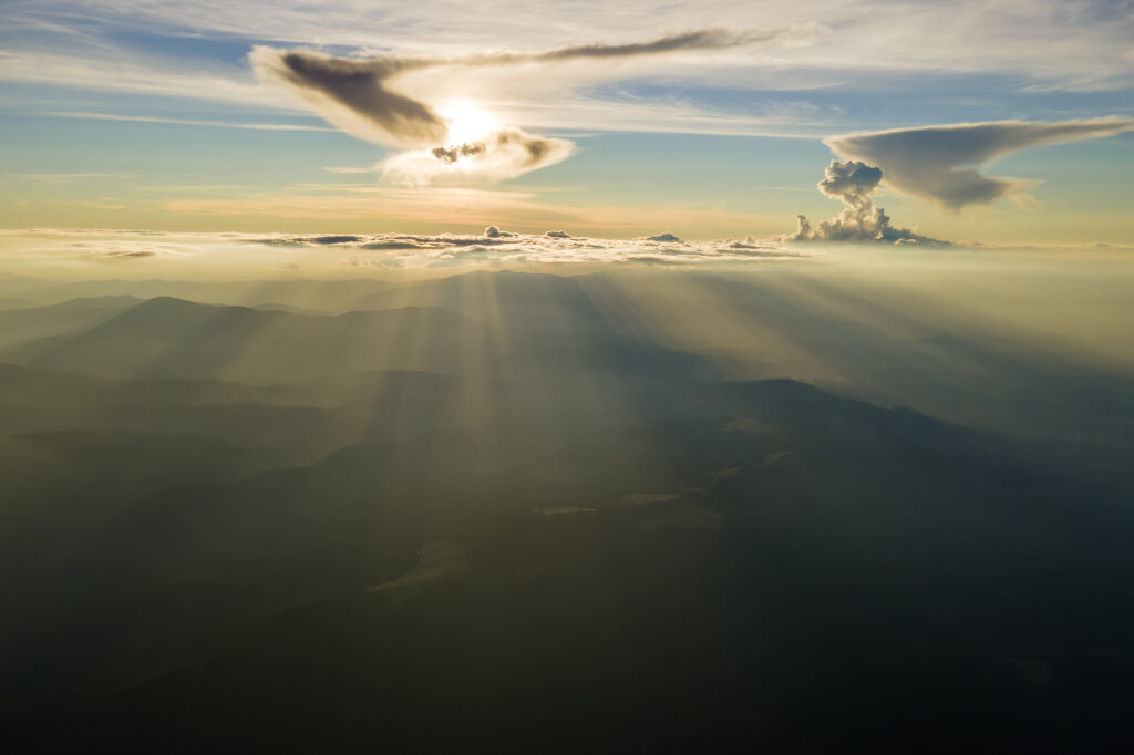Aerial view of dark mountain hills with bright sunrays of setting sun at sunset. Hazy peaks and misty valleys in evening.