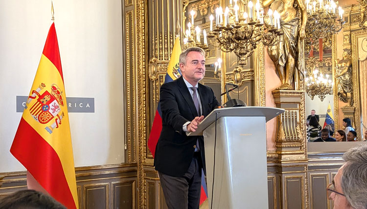 “En nombre de esta casa, introdujo el director de Casa América, es un placer darles la bienvenida a este encuentro organizado por la Embajada de la República donde estamos saboreando ya desde que pasamos aquí por los pasillos, y se huele este café maravilloso y cuando se prueba con un poco de chocolate, la verdad es que es un gran momento de la vida. Nos reunimos en este salón de embajadores para recorrer una historia que se cultiva, se huele, se saborea y se comparte. Una historia que ha moldeado territorios, comunidades y formas de vida, y que sigue evolucionando en diálogo con los desafíos que se encuentran hoy en día.”