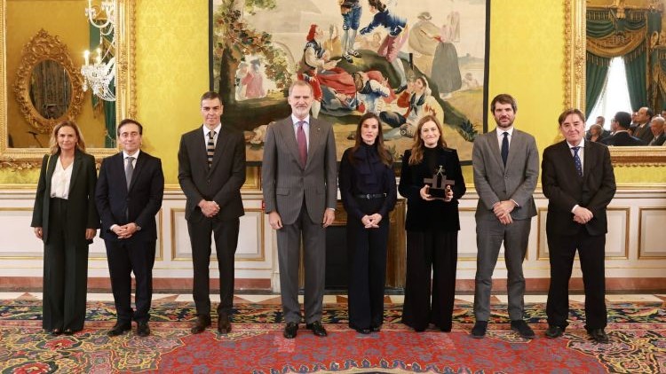 Los Reyes posan con Maria Delgado, Pedro Sánchez, Albares, Urtasun, Sumelzo y García Montero. / Foto: Casa de S.M. El Rey