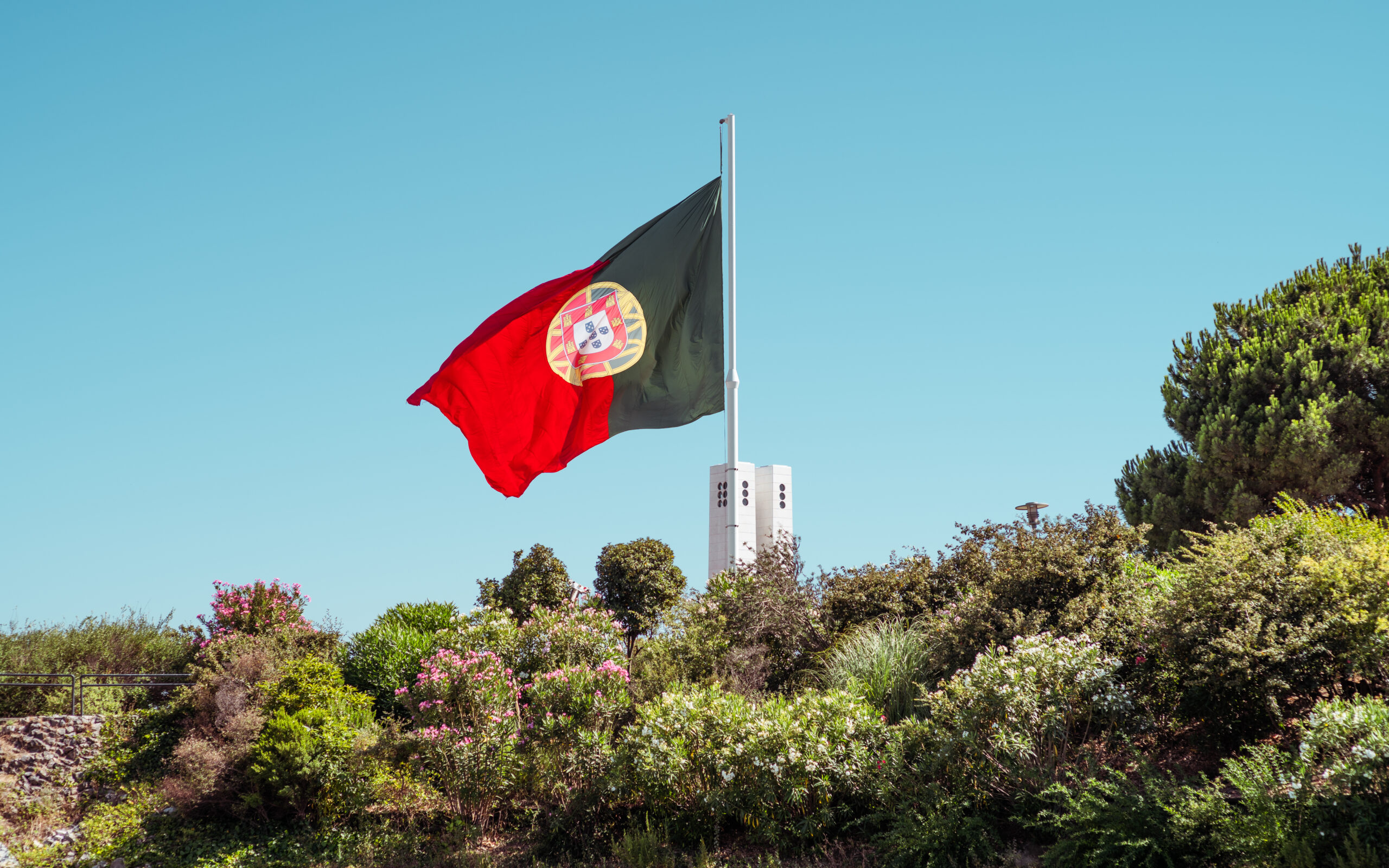The national flag of Portugal waves prominently on a tall flagpole, set against a clear blue sky. The flag is surrounded by lush greenery, including various trees and shrubs in a defocused foreground