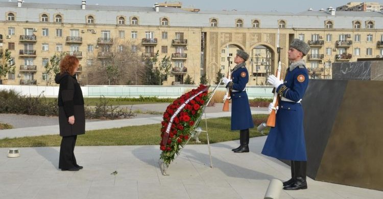 Francina Armengol durante la ofrenda floral en el Monumento a la Victoria. / Foto: www.trend.az