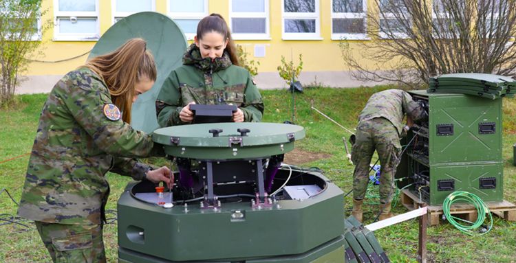 Mujeres en uniforme militar trabajando en un equipo tecnológico