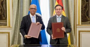 El ministro de Asuntos Exteriores, Unión Europea y Cooperación, José Manuel Albares, y el secretario general de la Organización de Estados Americanos (OEA), Albert Ramdin, firmaron este viernes